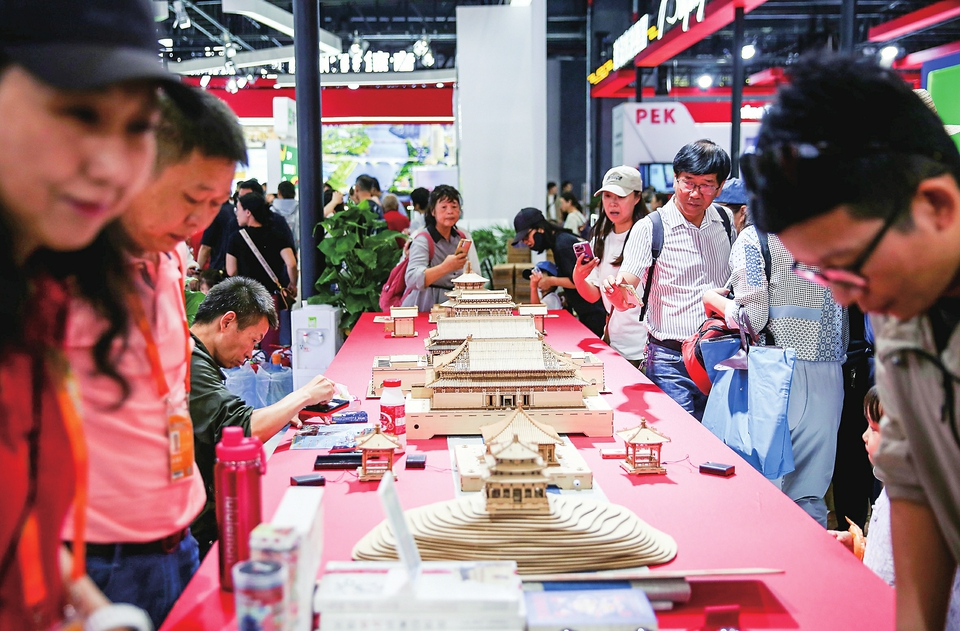 9月16日,在服贸会首钢园区,观众在首旅集团展台参观北京中轴线建筑榫卯模型。新华社记者 邹广萍 摄