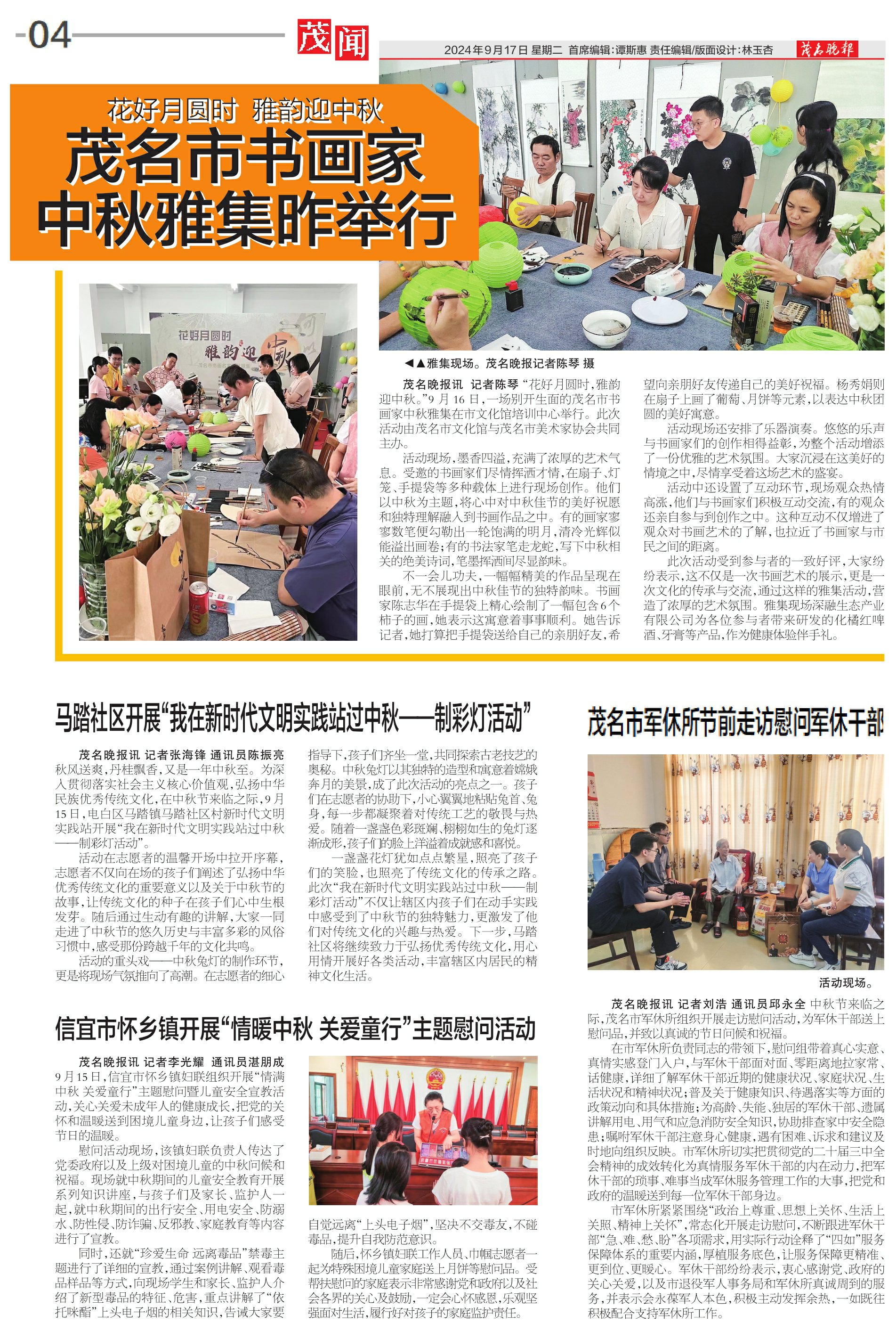 茂名晚报讯 记者 陈琴 “花好月圆时,雅韵迎中秋。”9月16日,一场别开生面的茂名市书画家中秋雅集在市文化馆培训中心举行。此次活动由茂名市文化馆与茂名市美术家协会共同主办。