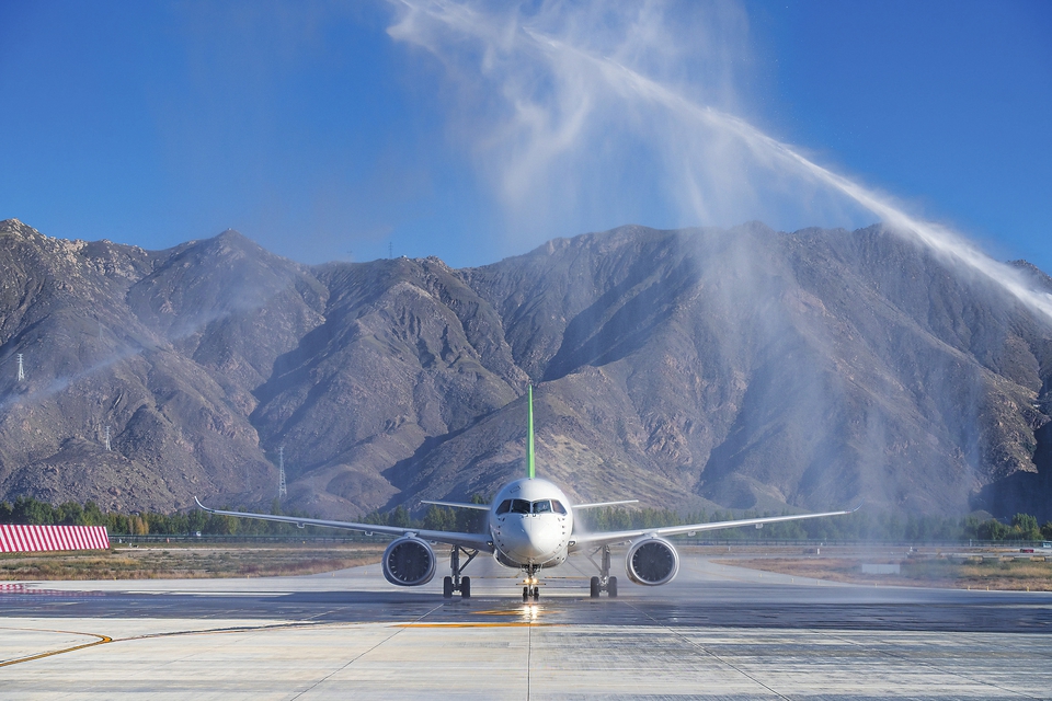 同一天,中国商飞公司一架从四川成都起飞的C919飞机,平稳降落在西藏拉萨贡嘎国际机场。