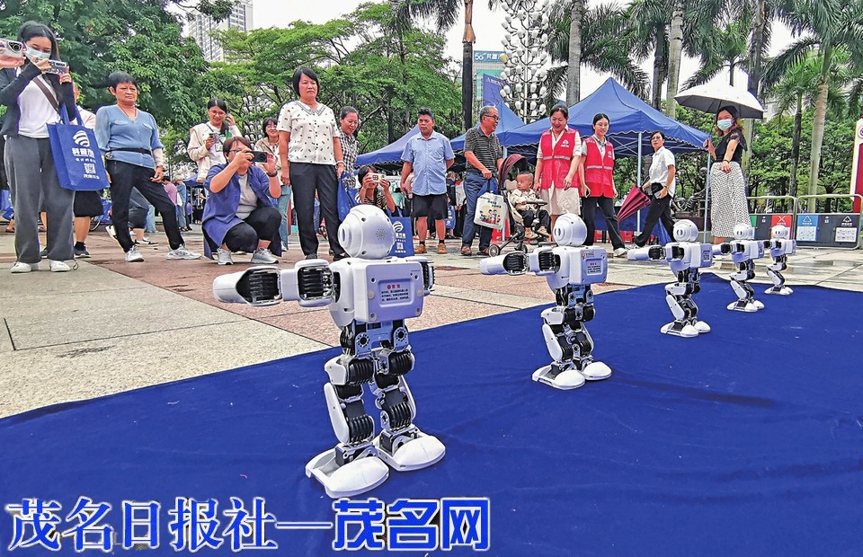 区红十字会摊位前也是热闹非凡,市民们对防溺水、气道异物梗塞急救、心肺复苏等非常感兴趣。“多学点急救知识,说不准哪天就用上了。”市民李女士告诉记者,她刚在志愿者的帮助下为假人道具做了一遍心肺复苏,也学习了除颤仪的用法。茂南区人民医院摊位前排起了长龙,现场免费测量血糖、血压,还有内科专家、中医科专家免费义诊。微思特科普教育基地的老师现场展示编程的魅力,5个机器人随音乐起舞,动作整齐划一,科技感十足。
