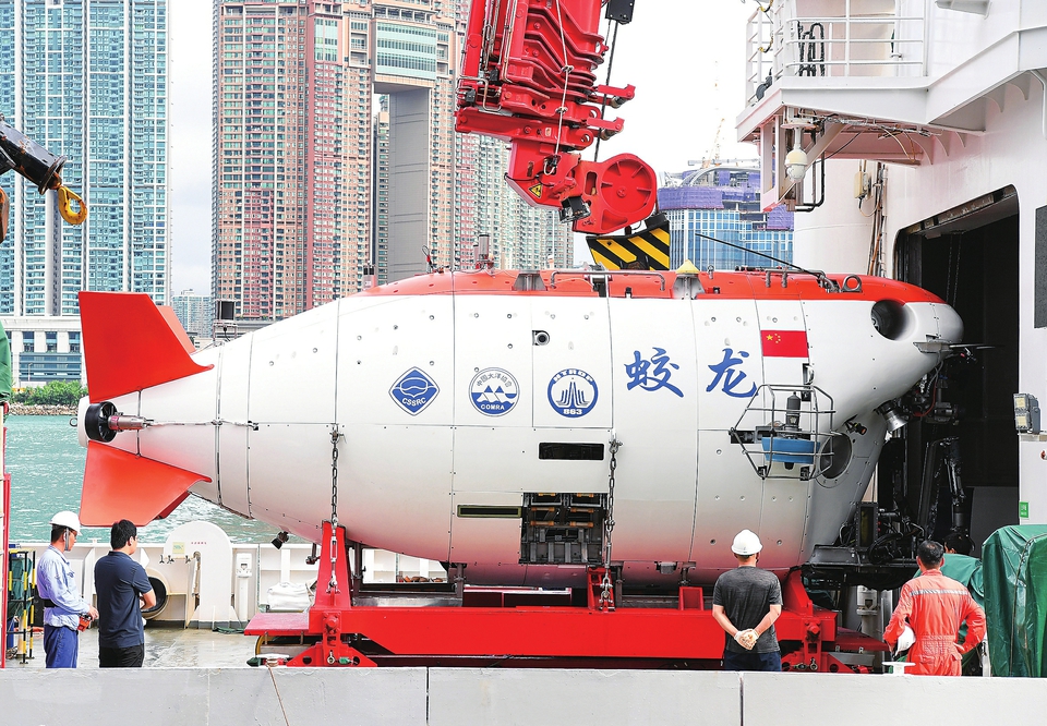 这是停靠于香港尖沙咀海运码头的“深海一号”远洋科考船上的“蛟龙号”(9月24日摄)。 新华社记者 陈铎 摄