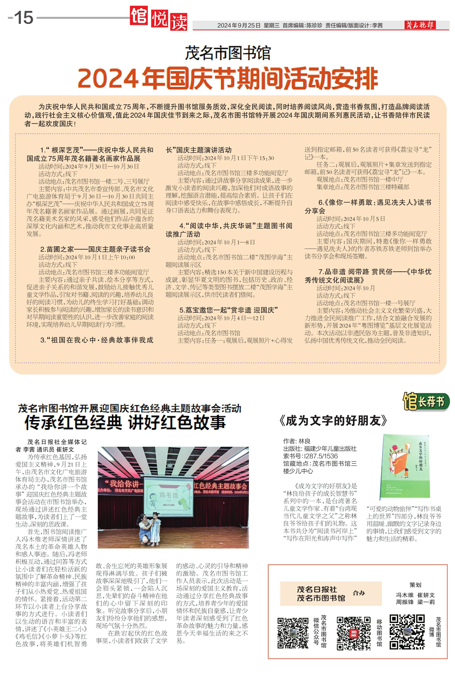 活动时间:2024年10月4日—12日活动方式:线下活动地点:茂名市图书馆主要内容:任务一:观展后,观展照片+心得发送到指定邮箱,前50名读者可获得《荔宝寻“龙”记》一本。