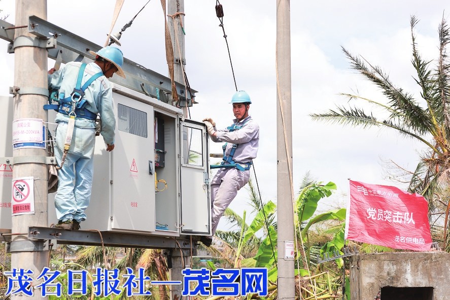 9月11日,抢修队伍完成海口市龙华区、美兰区88条中压故障跳闸线路抢修任务,用时仅4天。9月12日,完成海口市龙华区、美兰区717个低压台区抢修复电。9月14日,支援徐闻抢修队伍完成94公里中压线路、44个低压台区抢修复电。9月25日,完成海口市三江镇、大致坡镇295个自然村,12条中压线路,304个低压台区抢修复电。一组组捷报见证了抢修队伍的脚步与力量,履行对海南、湛江徐闻人民全面复电的承诺,贡献茂名力量!