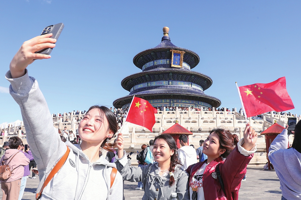 10月1日,游客在北京天坛公园祈年殿前拍照留念。 新华社发(陈晓根摄)