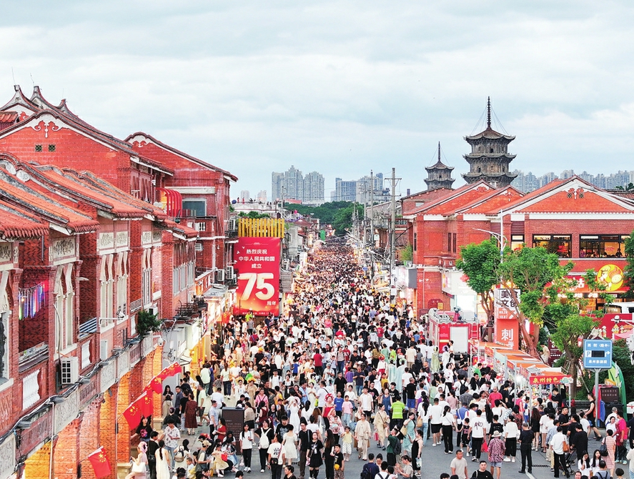 10月1日,游客在福建省泉州市西街游玩(无人机照片)。 新华社发(张九强摄)