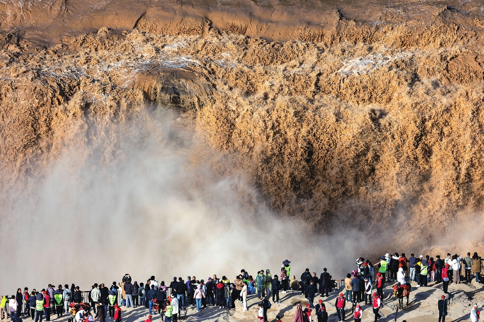 10月1日,游客在山西省临汾市吉县黄河壶口瀑布景区游览观瀑。 新华社发(刘宏达摄)