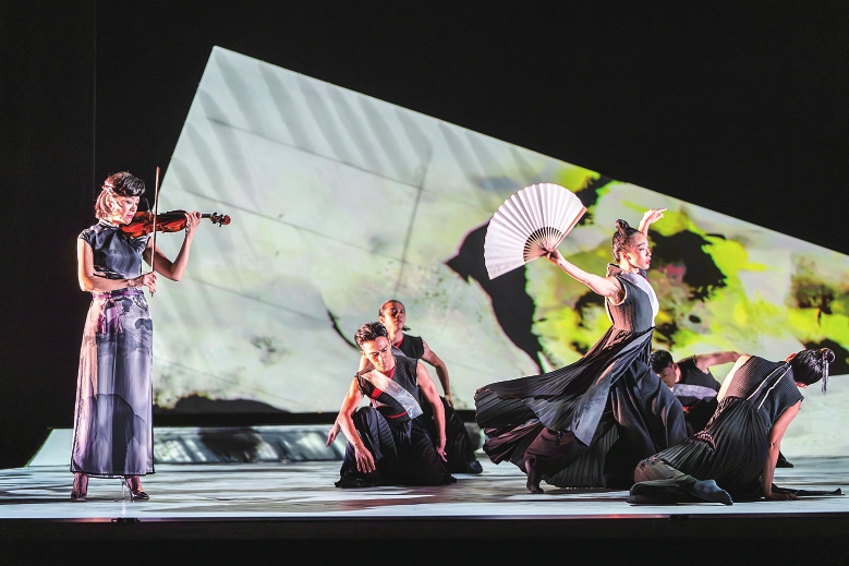 10月11日,香港舞蹈团《快雪时晴》在香港西九文化区戏曲中心上演,糅合舞蹈、书法、武术、弦乐及新媒体的跨界元素。新华社发(香港舞蹈团供图)