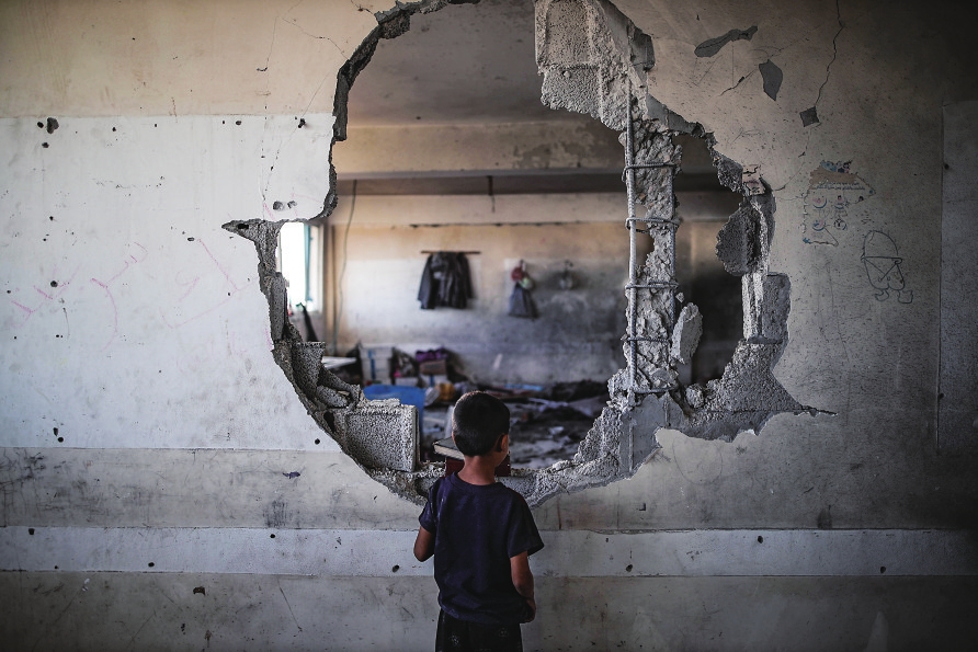 10月14日,在加沙地带中部努赛赖特难民营,一名儿童看着遭以军袭击的学校。新华社发(马尔万·达乌德摄)
