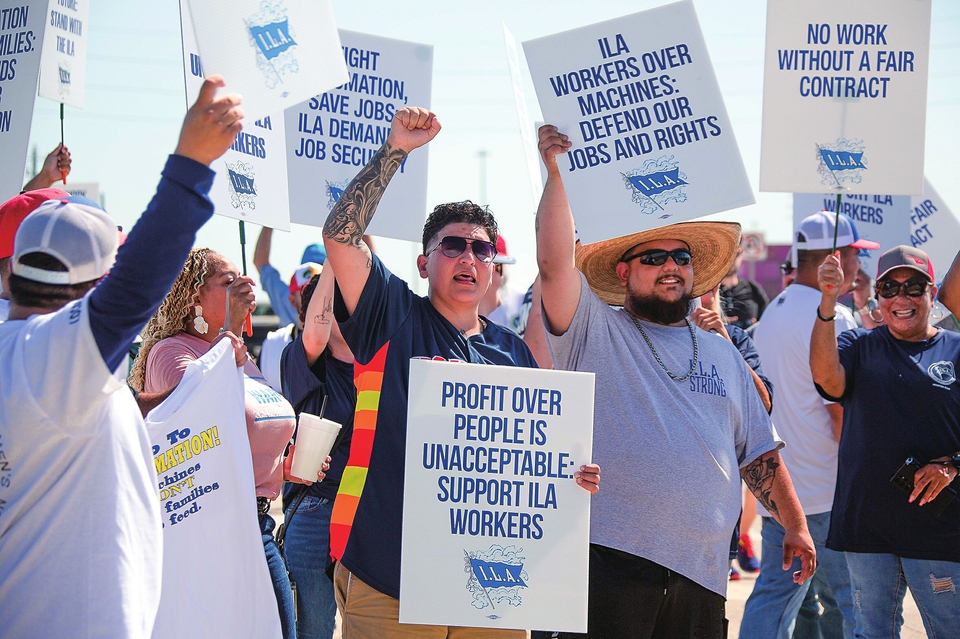 10月1日,美国东海岸和墨西哥湾沿岸30多个码头的数万名工人举行罢工,要求涨薪,反对港口机械设备自动化。新华社发(劳承跃摄)