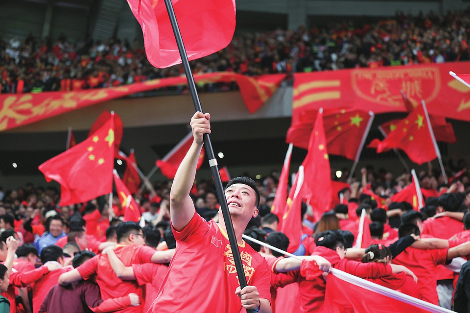 赛前一小时,国足球员进场热身,球迷们挥舞着一面面国旗,有节奏地呐喊、鼓掌、跳跃,用阵阵声浪为球员鼓劲。比赛开始后,能容纳5万人的球场看上去基本坐满,两个方阵的中国球迷,一个高喊“中国”,一个高喊“必胜”,接力声响彻球场。