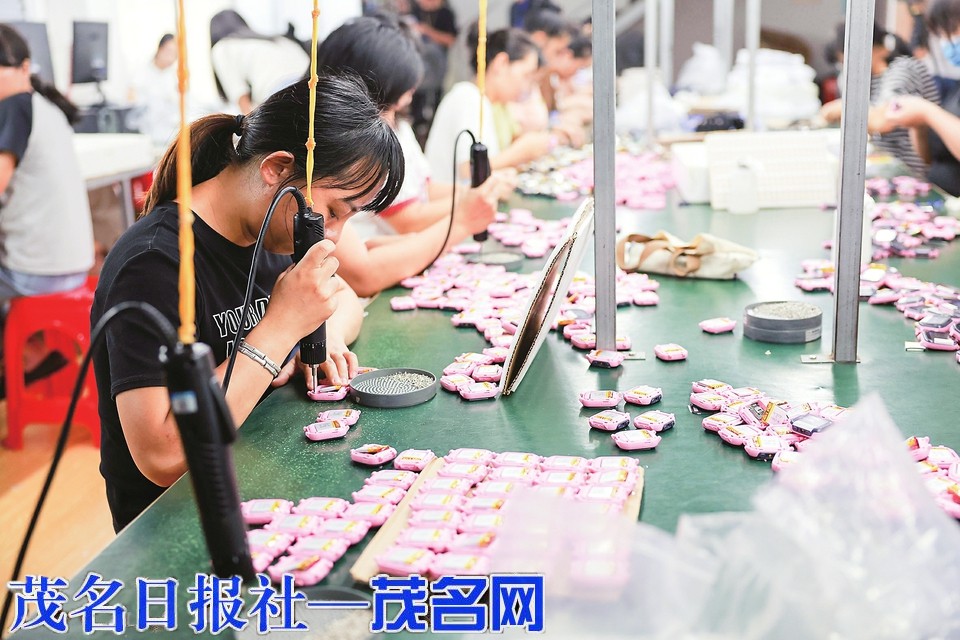 来到茂名市鑫鑫圆素科技有限公司电子表生产车间,30多名工人在各自工位手脚麻利地忙活着,加工、装配、测试……一道道流程结束后,一批批电子手表便生产完成。李女士是当地村民,她告诉记者,自己送完小孩上学,没什么事情做便来这里上班,工作很容易上手,也灵活自由,很喜欢这样的工作。企业负责人介绍道:“我们的工人主要都是周边的村民群众,经过培训后就可以上岗,我们按照计件付费、多劳多得、灵活就业的方式,企业盈利的同时也让村民增收”。