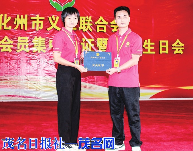 化州市义工联合会负责人(右)向新会员授证。茂名晚报记者 张富 摄