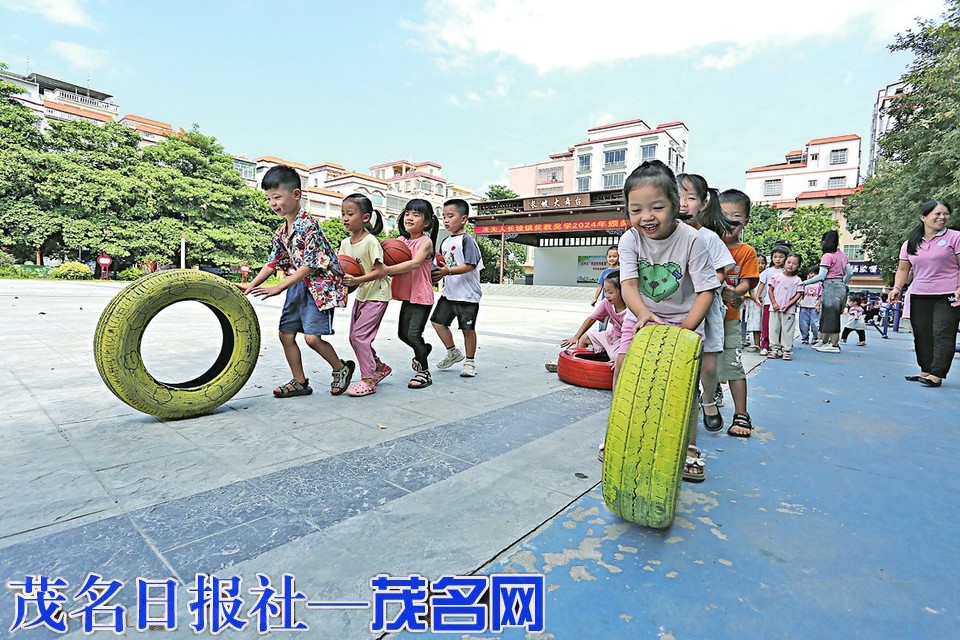 幼儿园的孩子们在冼夫人文化广场做游戏。
