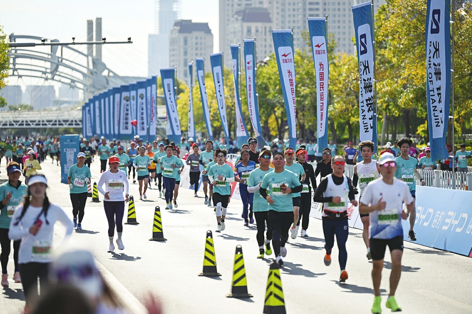 10月20日,参赛选手在比赛中。当日,2024天津马拉松鸣枪开跑。本次赛事共设置马拉松、半程马拉松、健康跑三个项目,约3万名跑者参赛。新华社记者孙凡越摄