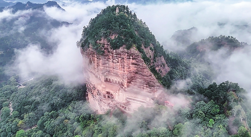 云雾笼罩中的麦积山。新华社发
