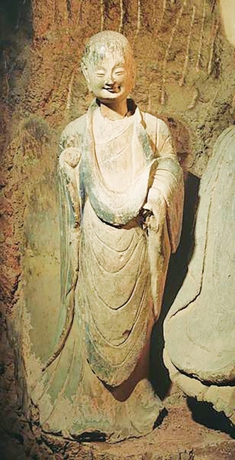这是麦积山石窟第133窟小沙弥立像,因微笑迷人,被誉为“东方微笑”。