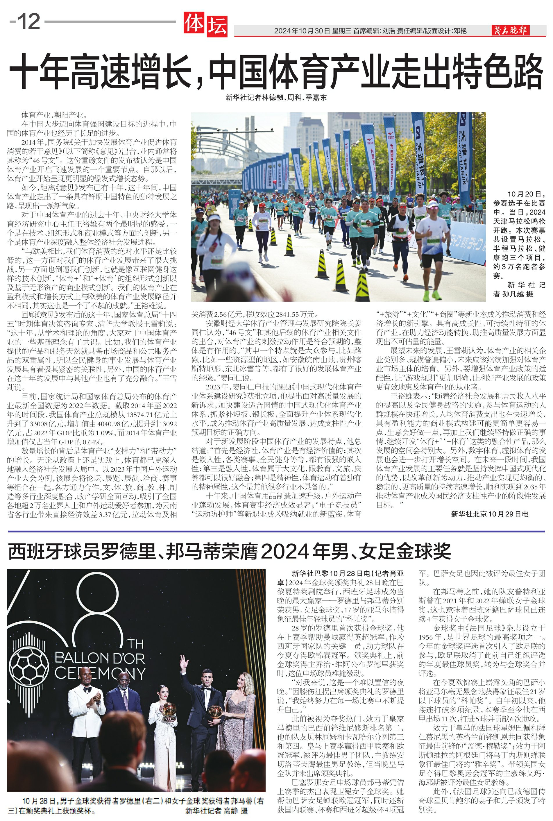 西班牙球员罗德里、邦马蒂荣膺2024年男、女足金球奖