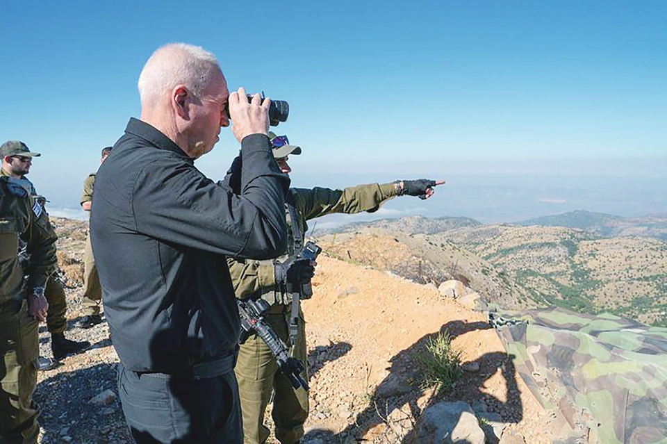 7月7日,以色列国防部长加兰特(前)在以色列控制的戈兰高地视察以军部队。新华社发(以色列国防部供图)