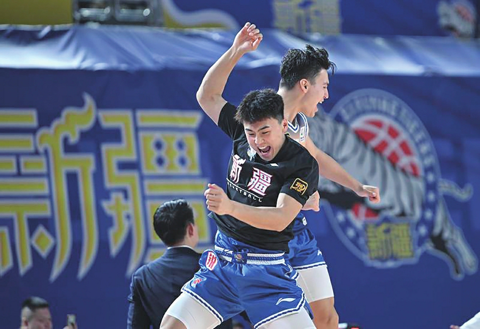 11月3日,新疆队球员葛浩然(左)与队友伊力福拉提在赛后庆祝。新华社记者 胡虎虎 摄