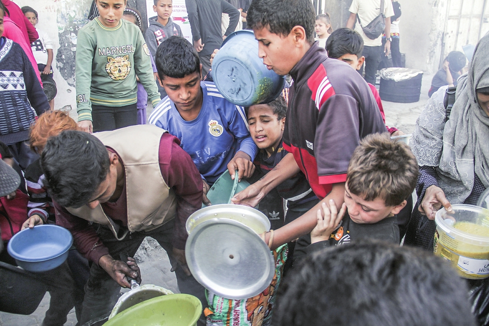 10月23日,人们在加沙地带北部的加沙城领取救济食品。新华社发(马哈茂德·扎基摄)