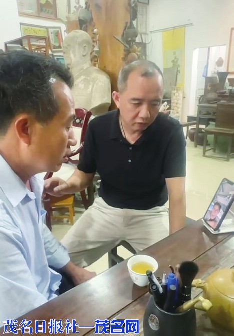 冯生在收藏馆与海外兄弟发起视频通话。茂名晚报记者 李光耀 摄