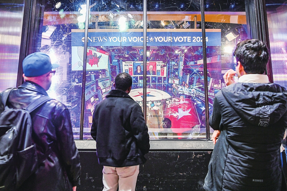 11月5日,人们在美国纽约时报广场观看实时出口民调。 美国媒体测算,共和党总统候选人特朗普已获得至少270张选举人票。新华社记者 李睿 摄