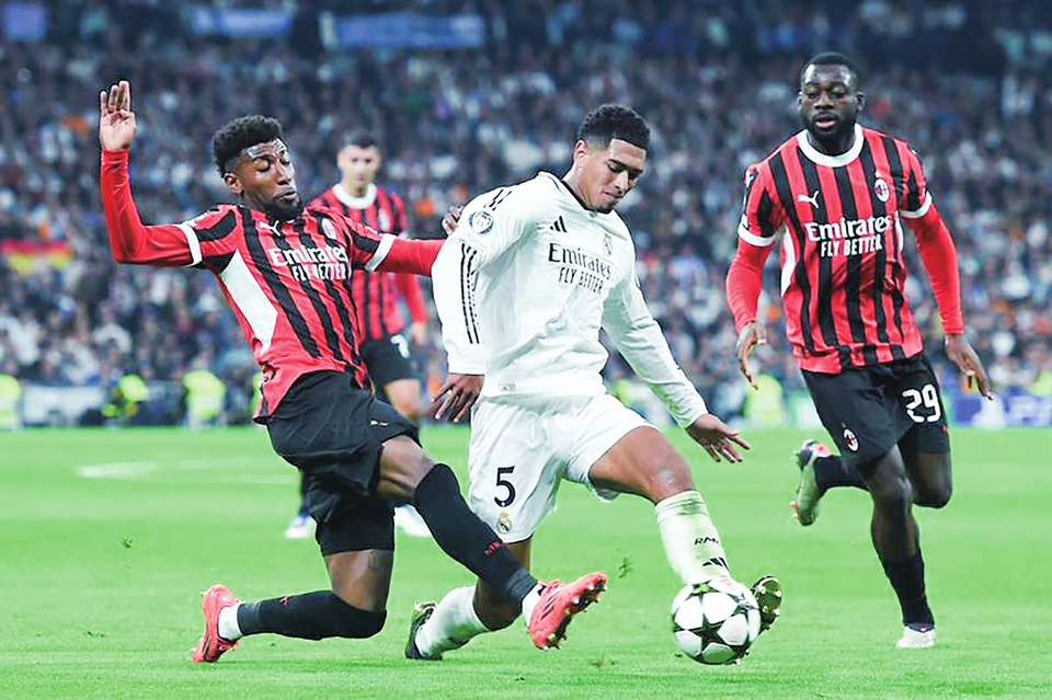 11月5日,皇家马德里队球员贝林厄姆(中)与AC米兰队球员埃默森在比赛中拼抢。新华社发(古斯塔沃·巴连特 摄)