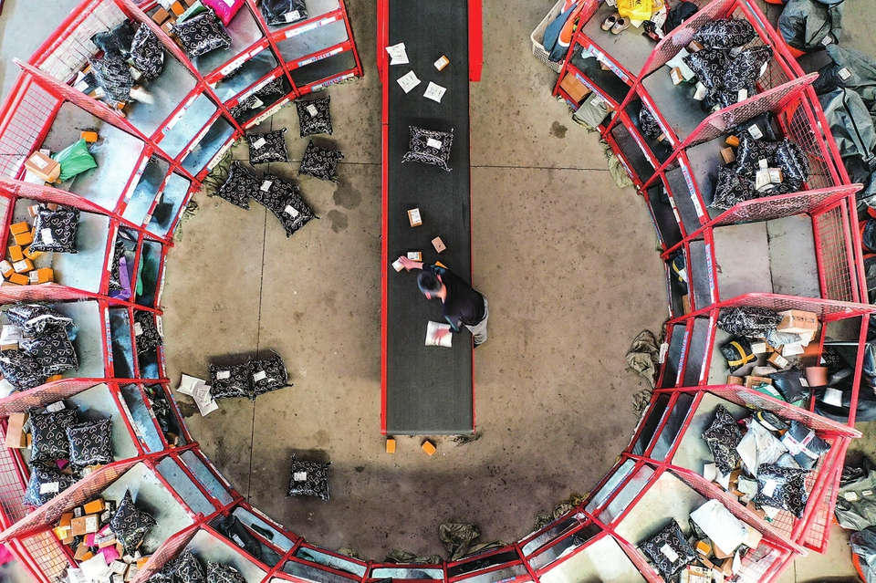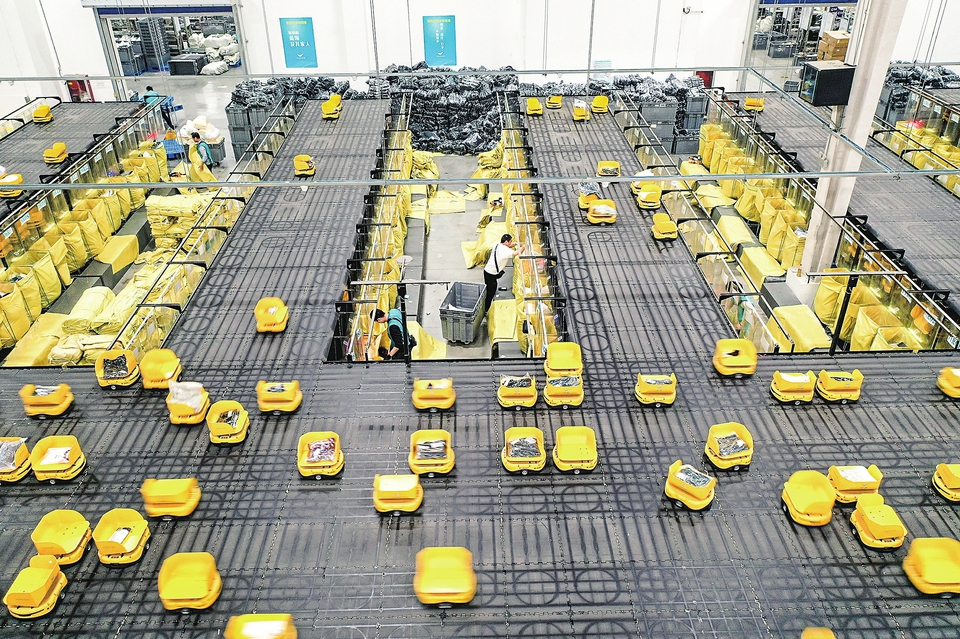 11月6日,工作人员在山东省宁阳县菜鸟智慧物流园内分拣快递商品(无人机照片)。新华社记者 朱峥 摄