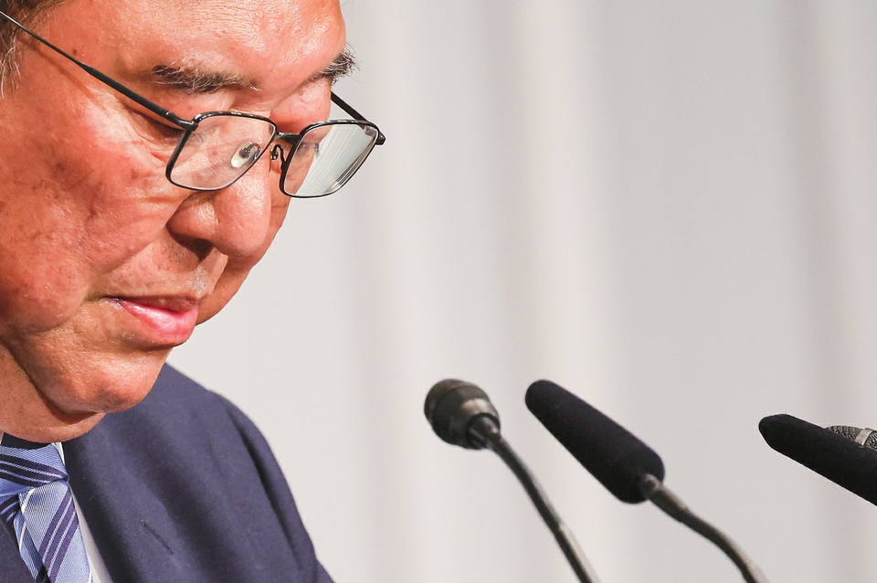 10月28日,日本首相、自民党总裁石破茂在日本东京自民党总部举行的记者会上讲话。新华社发(Pool图片,金敬勋摄)