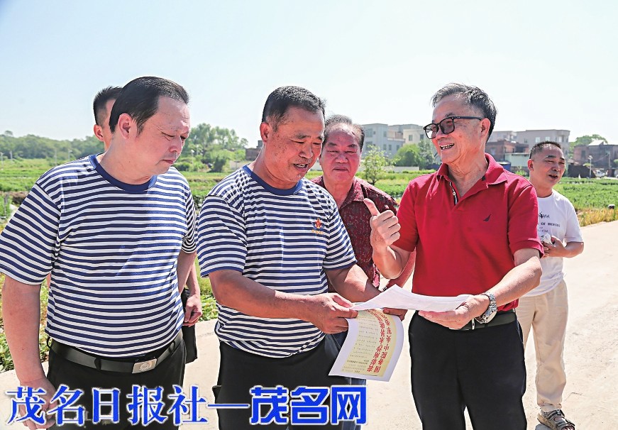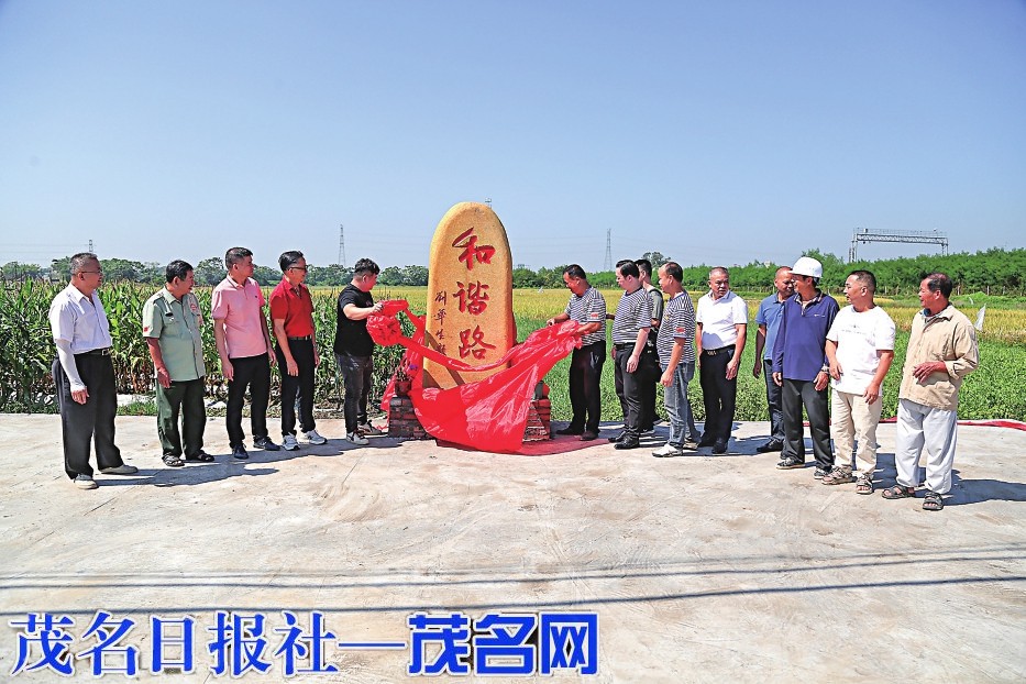 11月,茂名市茂南区鳌头镇的晚稻进入收割时节,天气也渐渐转凉。但晴天的太阳,还是火辣辣的。在明晃晃的阳光下,鳌头镇梅州村和文屋村之间一块新建的石碑,显得有些耀眼。石碑上刻印有三个鲜红的大字:和谐路。