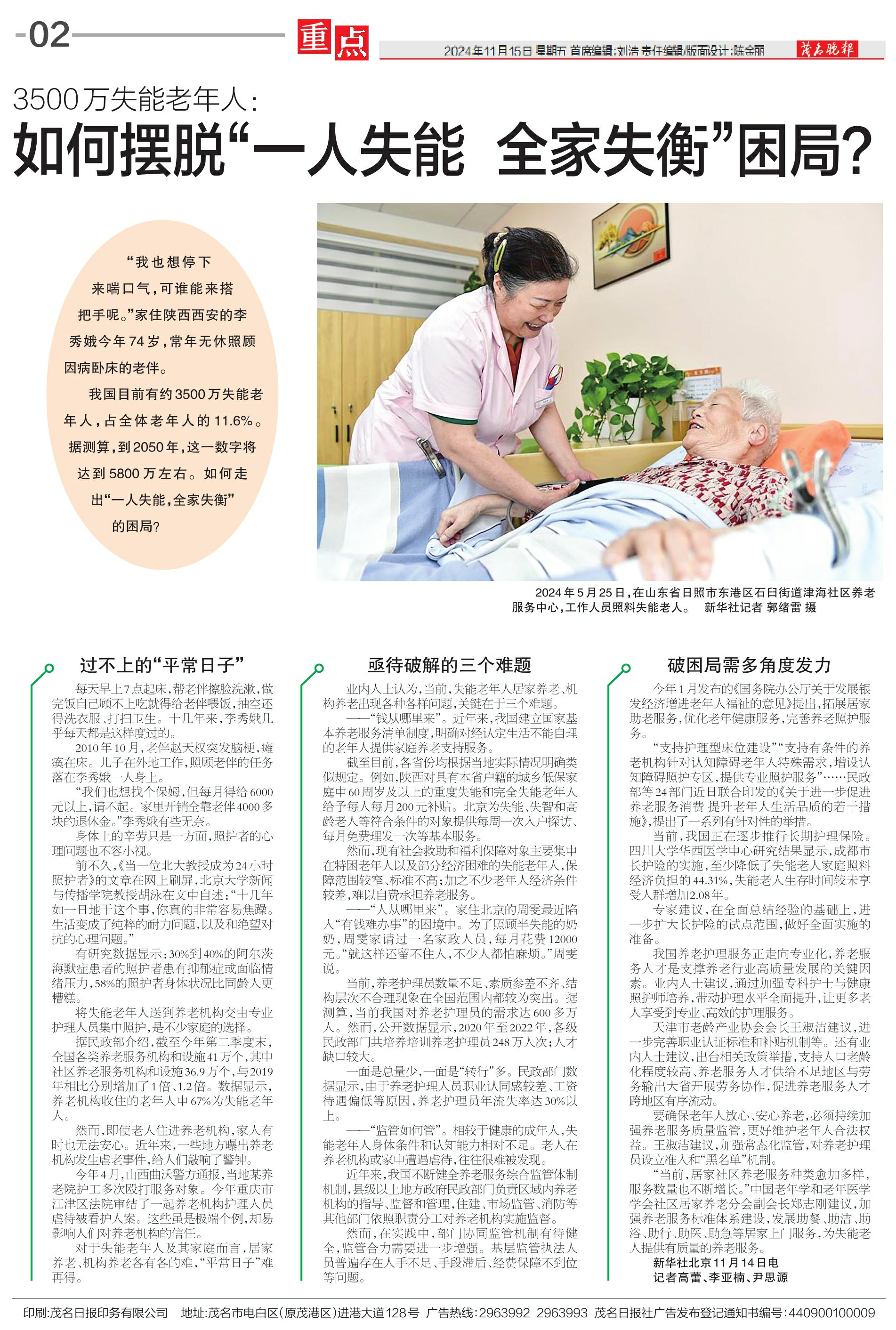 我国目前有约3500万失能老年人,占全体老年人的11.6%。据测算,到2050年,这一数字将达到5800万左右。如何走出“一人失能,全家失衡”的困局?