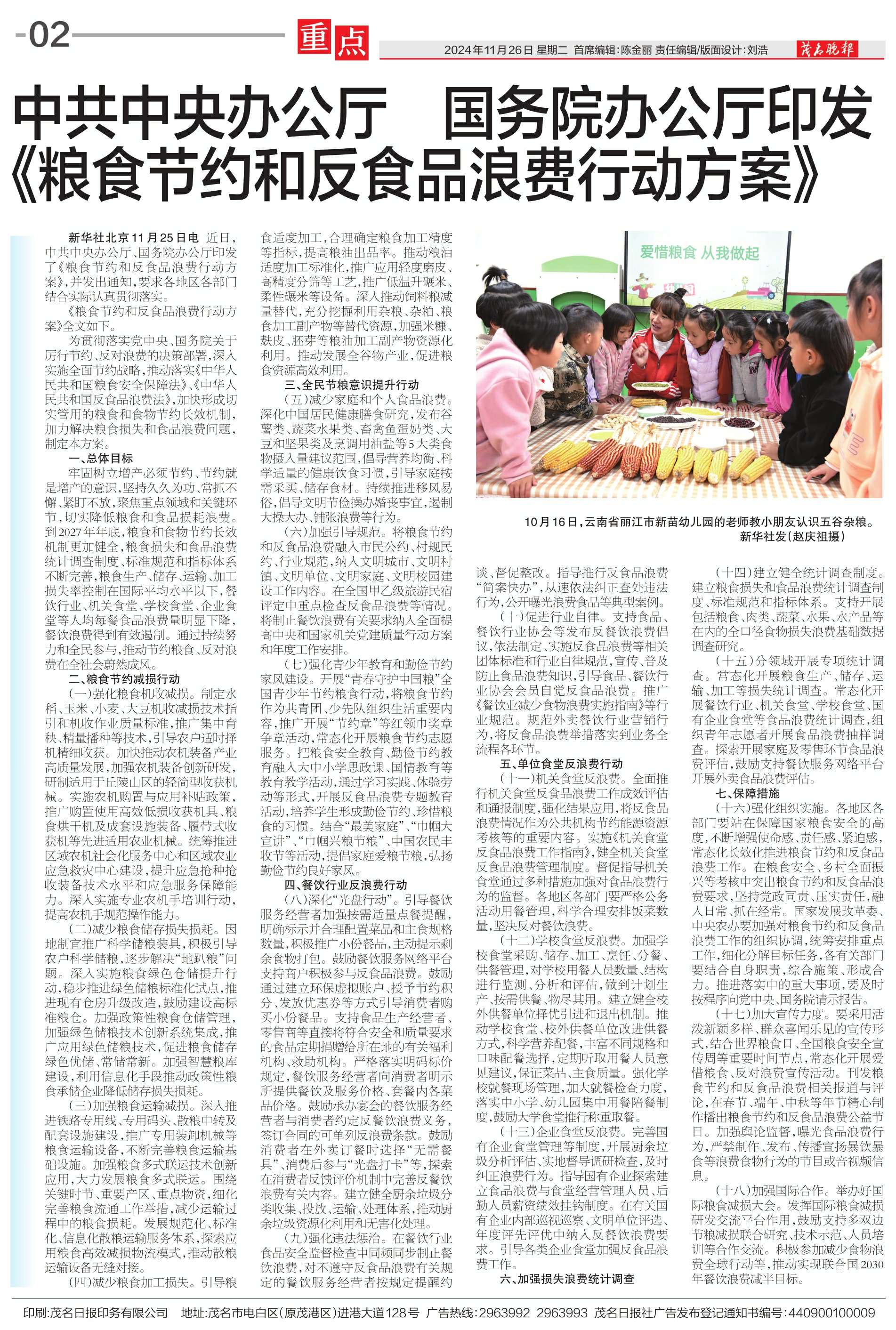 中共中央办公厅 国务院办公厅印发《粮食节约和反食品浪费行动方案》