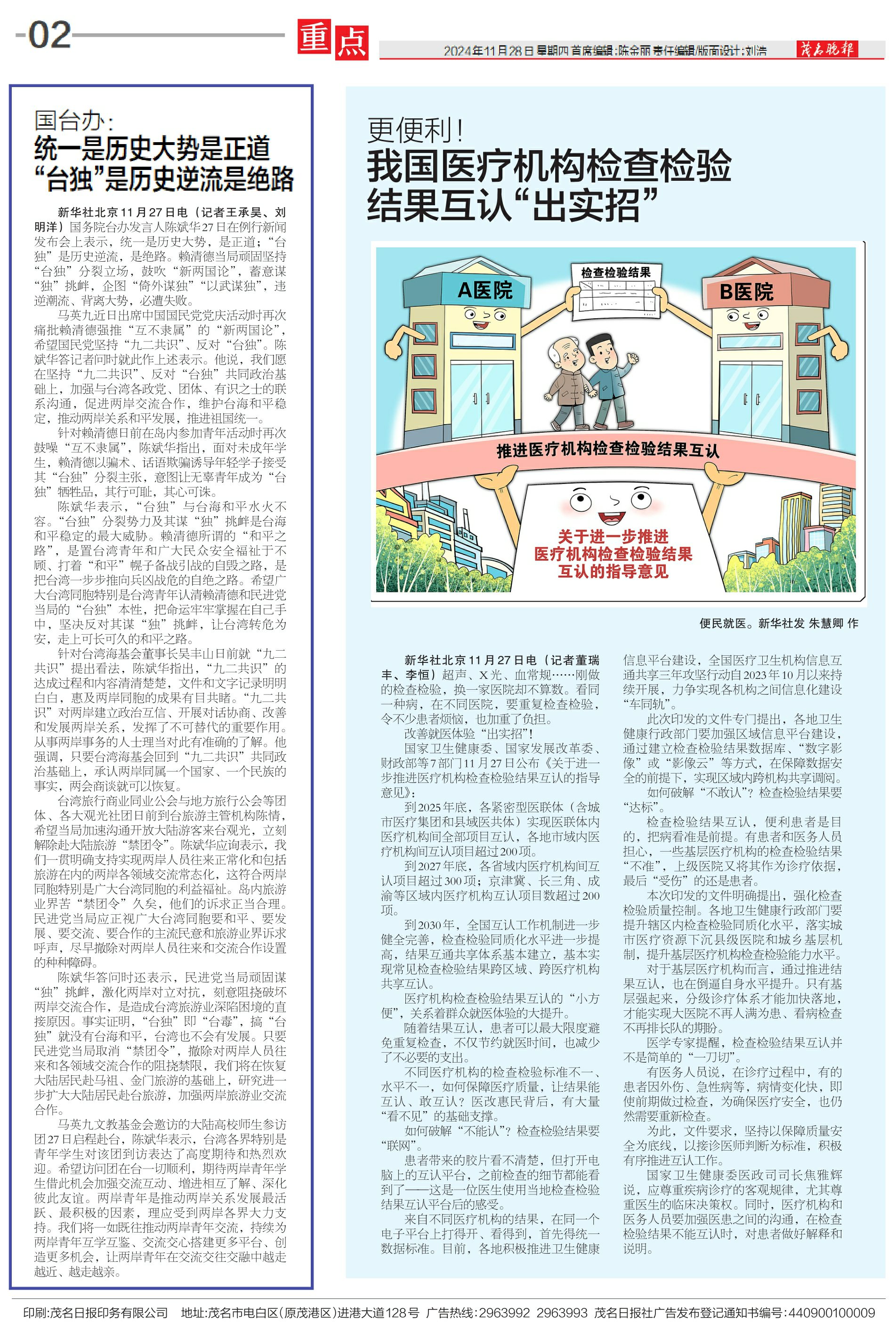 新华社北京11月27日电(记者王承昊、刘明洋)国务院台办发言人陈斌华27日在例行新闻发布会上表示,统一是历史大势,是正道;“台独”是历史逆流,是绝路。赖清德当局顽固坚持“台独”分裂立场,鼓吹“新两国论”,蓄意谋“独”挑衅,企图“倚外谋独”“以武谋独”,违逆潮流、背离大势,必遭失败。