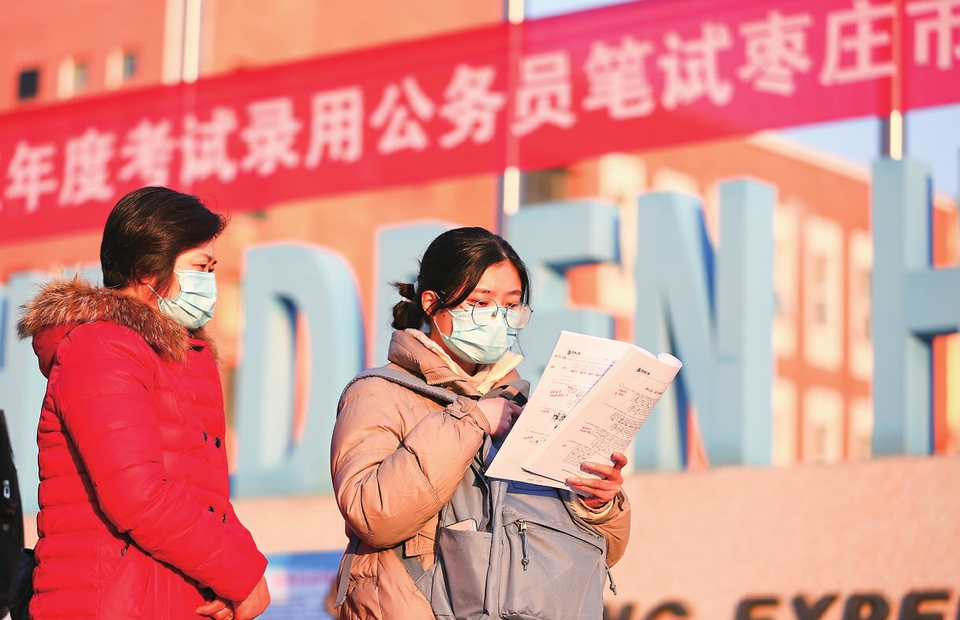 12月1日,在山东省枣庄市实验小学(薛城)考点,一名考生(右)在入场前抓紧时间复习。 新华社发(李志军摄)