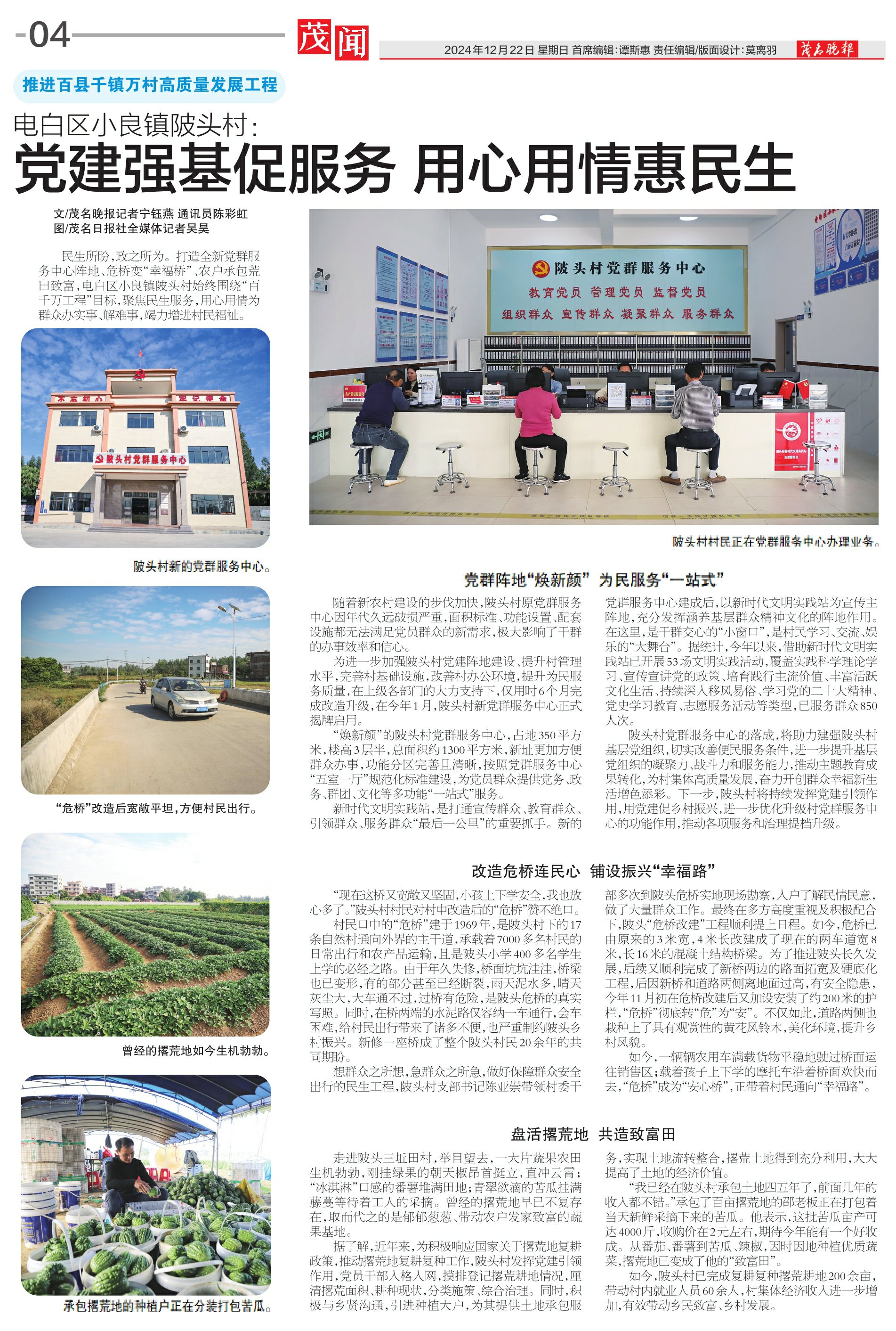 民生所盼,政之所为。打造全新党群服务中心阵地、危桥变“幸福桥”、农户承包荒田致富,电白区小良镇陂头村始终围绕“百千万工程”目标,聚焦民生服务,用心用情为群众办实事、解难事,竭力增进村民福祉。