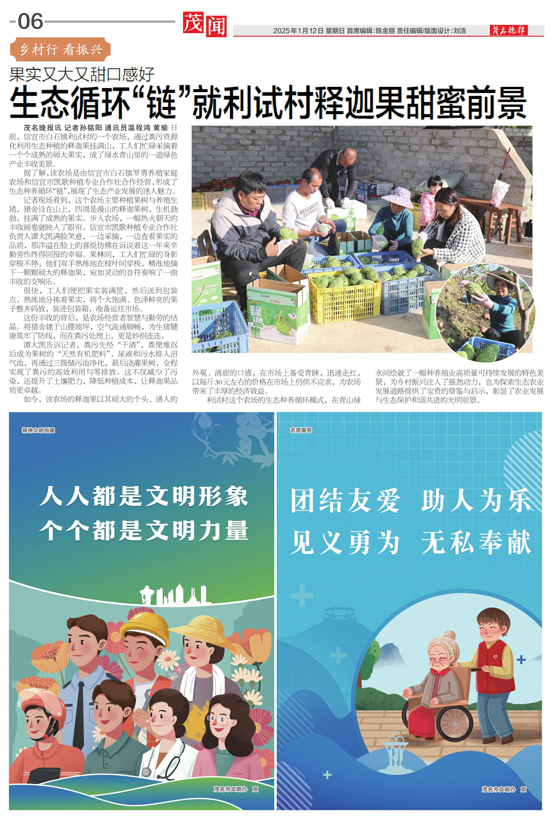 茂名晚报讯记者 孙铭阳 通讯员 温程鸿黄瑜日前,信宜市白石镇利试村的一个农场,通过粪污资源化利用生态种植的释迦果挂满山,工人们忙碌采摘着一个个成熟的硕大果实,成了绿水青山里的一道绿色产业丰收美景。