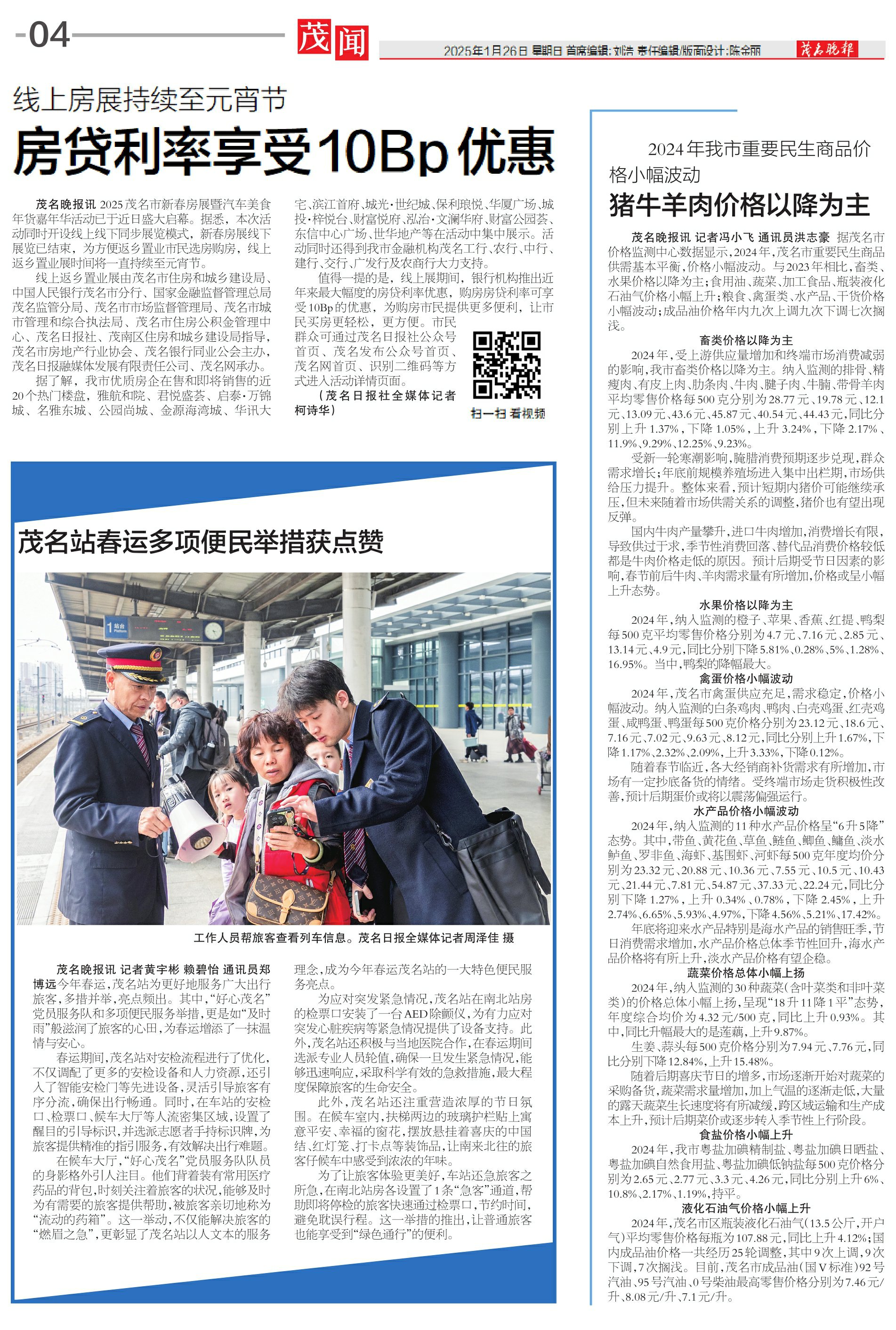 茂名晚报讯 记者 冯小飞 通讯员 洪志豪 据茂名市价格监测中心数据显示,2024年,茂名市重要民生商品供需基本平衡,价格小幅波动。与2023年相比,畜类、水果价格以降为主;食用油、蔬菜、加工食品、瓶装液化石油气价格小幅上升;粮食、禽蛋类、水产品、干货价格小幅波动;成品油价格年内九次上调九次下调七次搁浅。