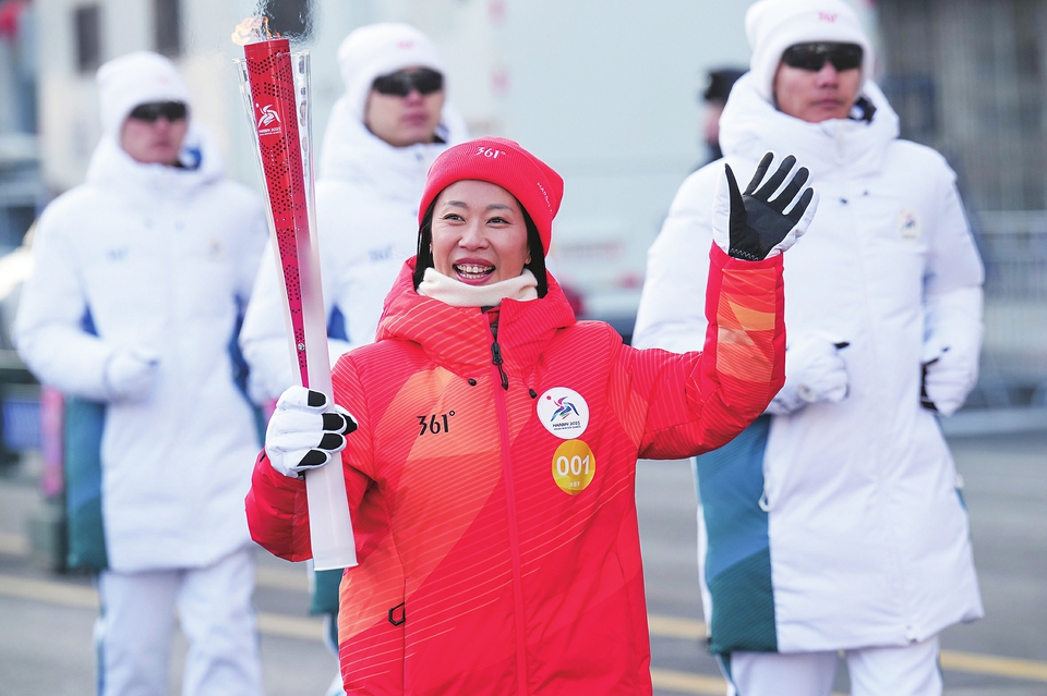 ▲2月3日,第一棒火炬手、奥运冠军申雪在传递火炬。新华社记者 王松 摄