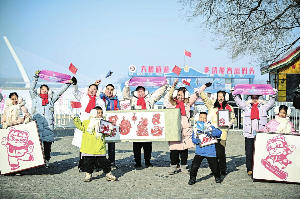 啦啦操、快闪合唱、街头器乐演奏、国标舞、冰雕制作……沿途,丰富多彩的群众活动营造出满满氛围感。在五星红旗的掩映下,滨洲铁路桥焕然一新,高校大学生置身大型亚冬会主题画框,合唱《我和我的祖国》,留下精彩一瞬。