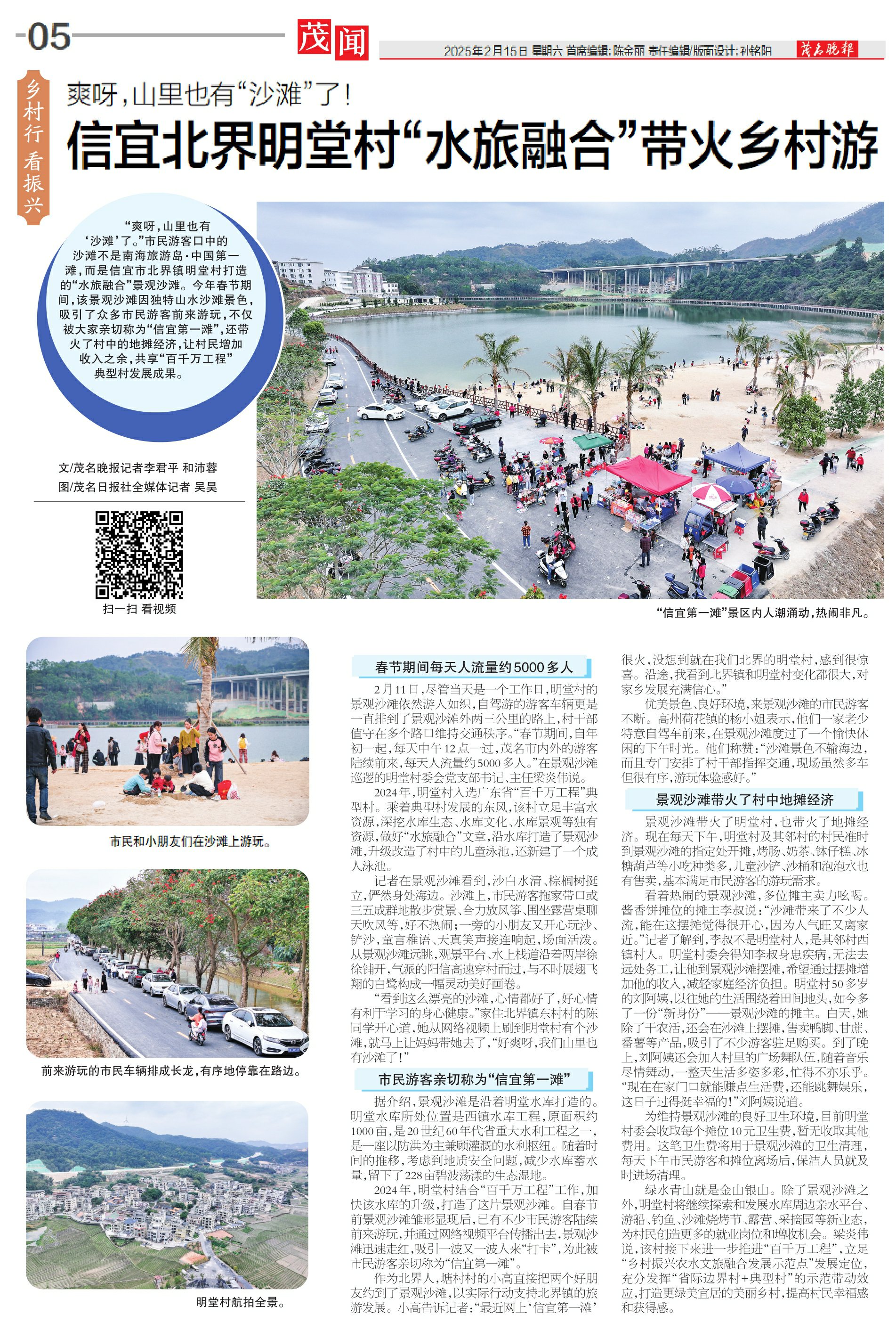“爽呀,山里也有‘沙滩’了。”市民游客口中的沙滩不是南海旅游岛·中国第一滩,而是信宜市北界镇明堂村打造的“水旅融合”景观沙滩。今年春节期间,该景观沙滩因独特山水沙滩景色,吸引了众多市民游客前来游玩,不仅被大家亲切称为“信宜第一滩”,还带火了村中的地摊经济,让村民增加收入之余,共享“百千万工程”典型村发展成果。