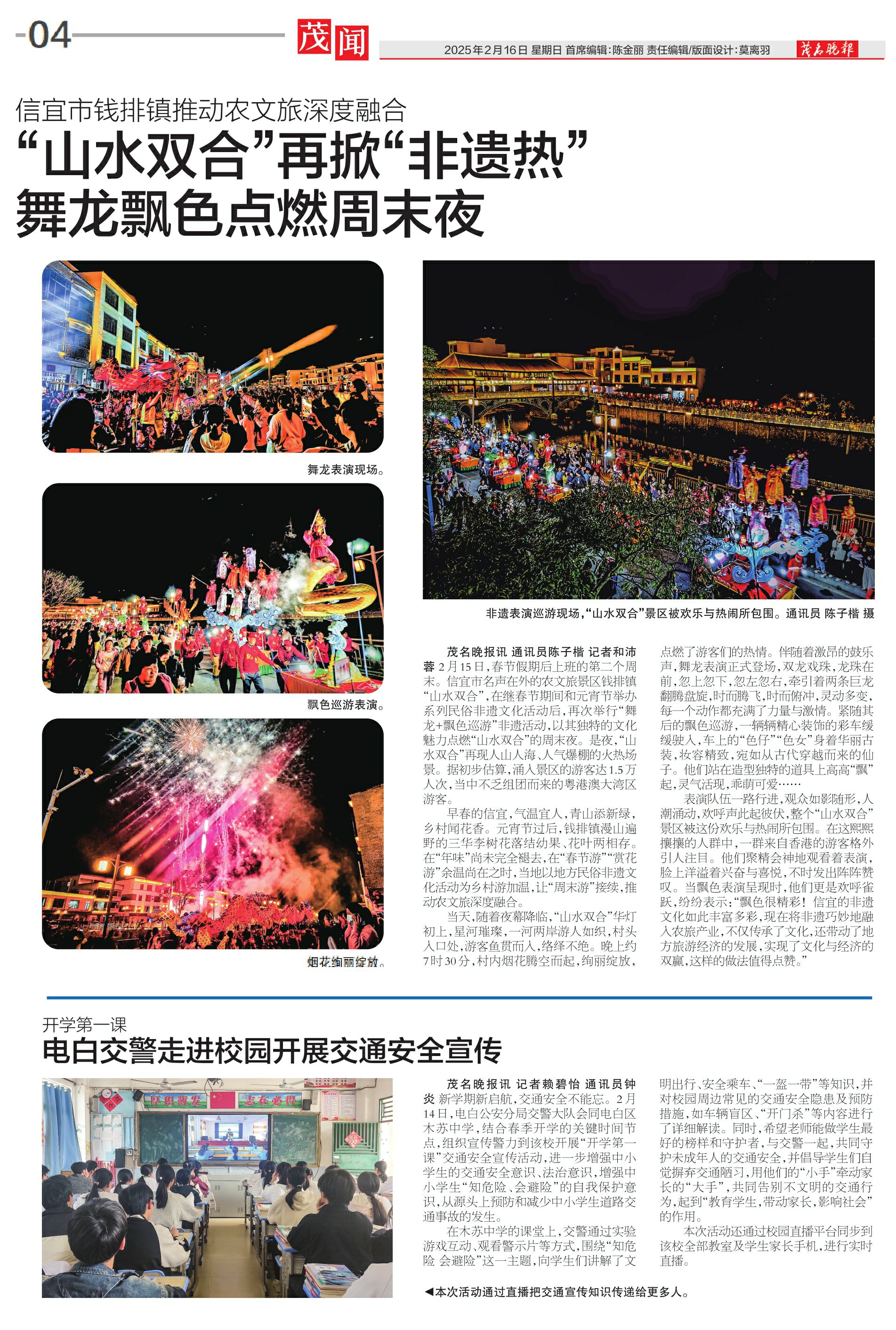 茂名晚报讯 记者 赖碧怡 通讯员 钟炎 新学期新启航,交通安全不能忘。2月14日,电白公安分局交警大队会同电白区木苏中学,结合春季开学的关键时间节点,组织宣传警力到该校开展“开学第一课”交通安全宣传活动,进一步增强中小学生的交通安全意识、法治意识,增强中小学生“知危险、会避险”的自我保护意识,从源头上预防和减少中小学生道路交通事故的发生。