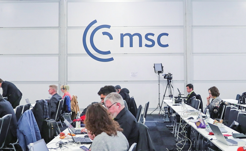 2月16日,在德国慕尼黑,媒体记者在慕安会新闻中心工作。新华社记者 张帆 摄