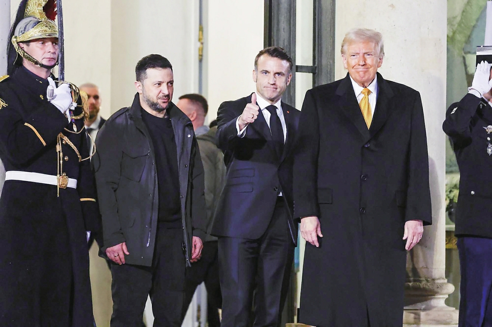 2024年12月7日,法国总统马克龙(左三)与美国当选总统特朗普(右)和乌克兰总统泽连斯基(左二)会晤后走出爱丽舍宫。新华社发(亨利·施瓦茨 摄)
