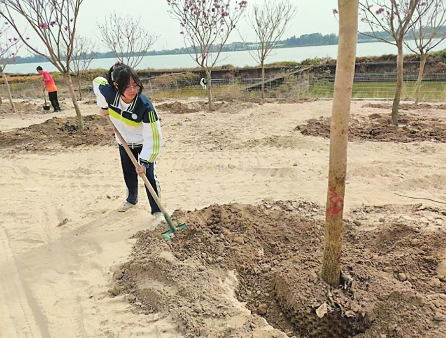 果不其然,我连土都铲不起,更别说埋树根了!望着身边的人个个奋力干活,而我却只能干站着,我想我不能袖手旁观,要积极参与其中。于是学着其他人的样子,一步一步模仿——先把铲子插入土中,再用脚踩铲边,然后铲起土,再然后把土抛向树根,最终在我的不懈努力下成功种下了一棵树,最后给它浇上水。