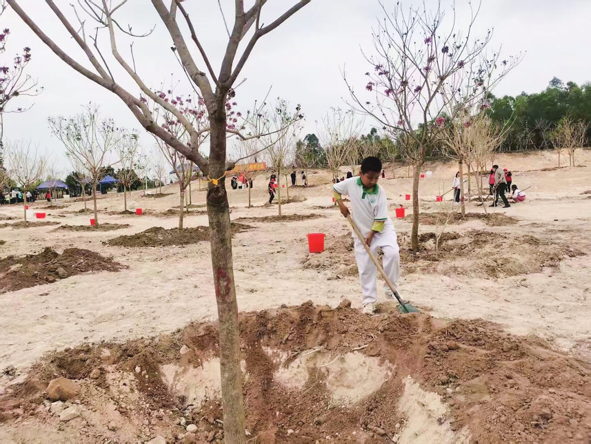 填土时,爸爸双手稳稳握住铁锹,一铲又一铲地将土铲进树坑。他的动作娴熟而有力,每铲起一锹土,都精准地倒入坑中,还不时用脚把土踏实。小记者们也不甘示弱,有的蹲下身子,用手将散落的土块聚拢到树坑边;有的则在一旁帮忙扶正树苗,大家齐心协力,配合得十分默契。我也学着爸爸的样子,拿起小铲子,努力地将周围的土铲进坑里,虽然动作略显笨拙,但心中的热情却丝毫不减。土渐渐填满了树坑,小树苗也在我们的努力下,稳稳地扎根在了这片土地上。