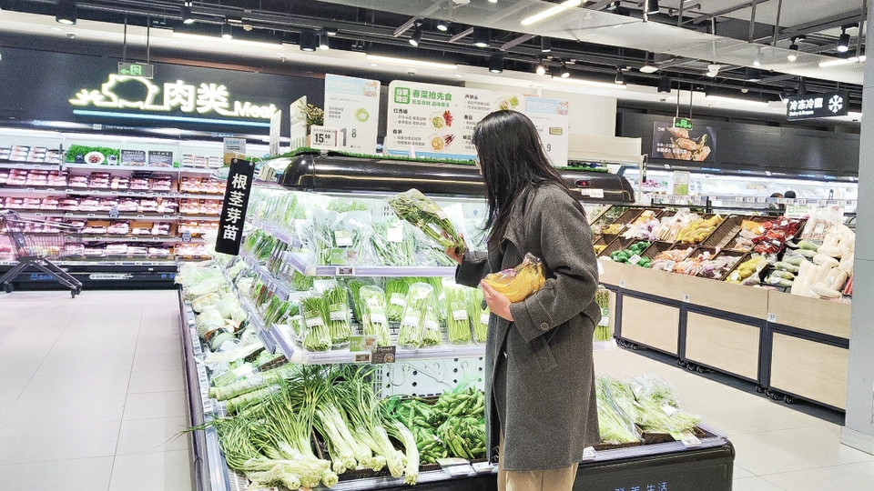 2 月 21日,消费者在武汉市盒马鲜生岳家嘴店内选购板蓝根青菜。新华社记者 熊翔鹤 摄