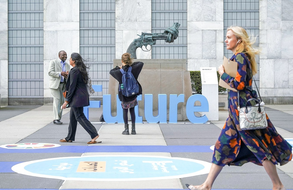 2024年9月23日,在位于纽约的联合国总部,与会者从联合国未来峰会会场外走过。新华社记者 吴晓凌 摄