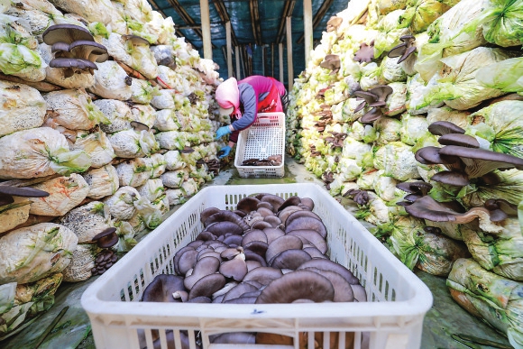 ▲2月24日,河北省唐山市丰南区东田庄镇大吴庄村农民在大棚内采摘平菇。新华社发(李秀清 摄)