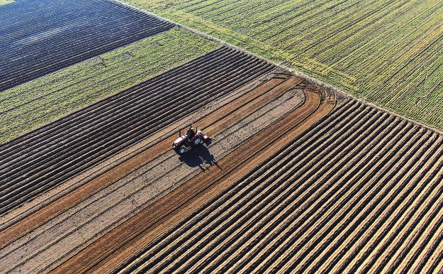 ▲2月24日,山东省临沂市平邑县仲村镇农民在田间翻耕土地(无人机照片)。新华社发(武纪全 摄)