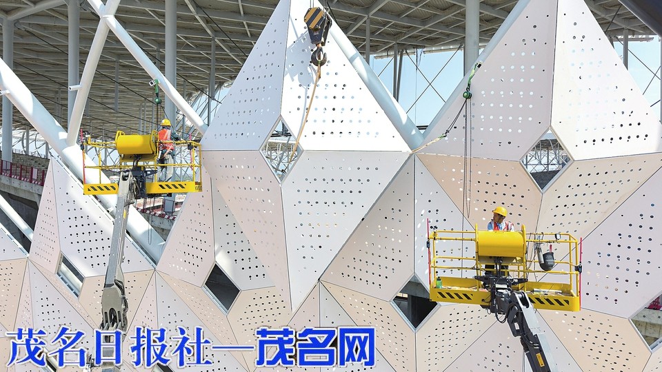 一块块白色的外墙立面幕墙被工人安装到体育场钢结构的外墙上。茂名日报社全媒体记者 周泽佳 摄